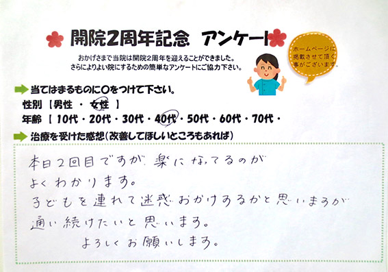 本日2回目ですが楽になってるのがよくわかります。子どもを連れて迷惑おかけするかと思いますが通い続けたいと思います。宜しくお願いします