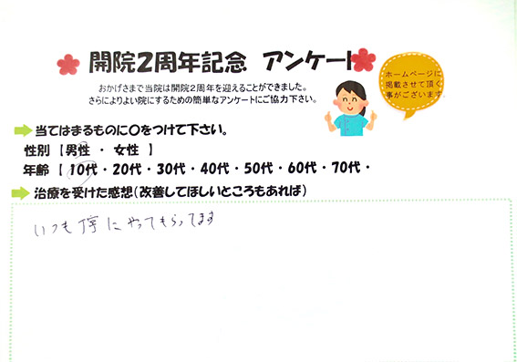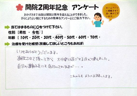 いつもありがとうございます。通院させて頂いてから大分楽に過ごせる日が増えました。自分の運動不足にも気付かされますが…。これからもよろしくお願いします。