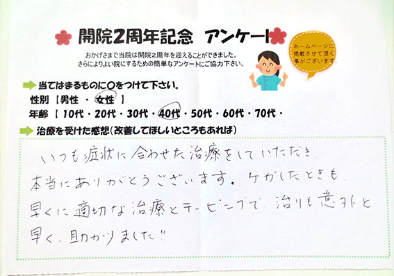 いつも症状に合わせた治療をして頂き本当にありがとうございます。ケガをした時も早くに適切な治療とテーピングで治りも意外と早く助かりました。